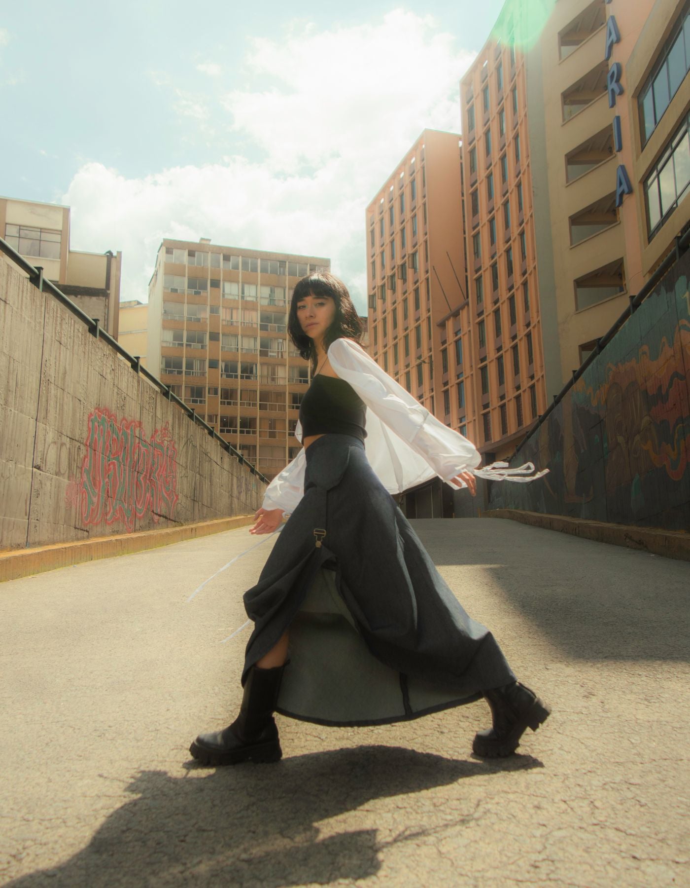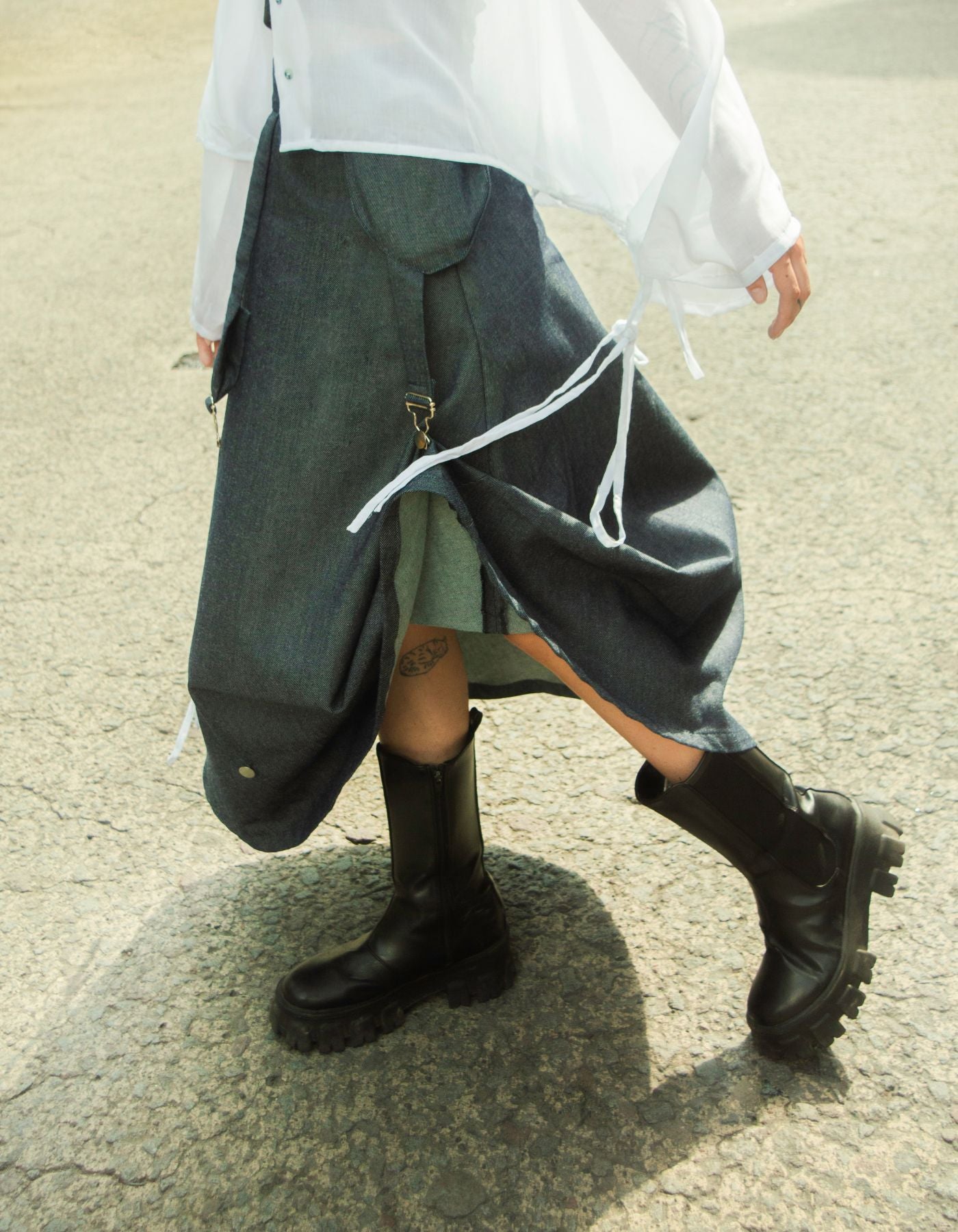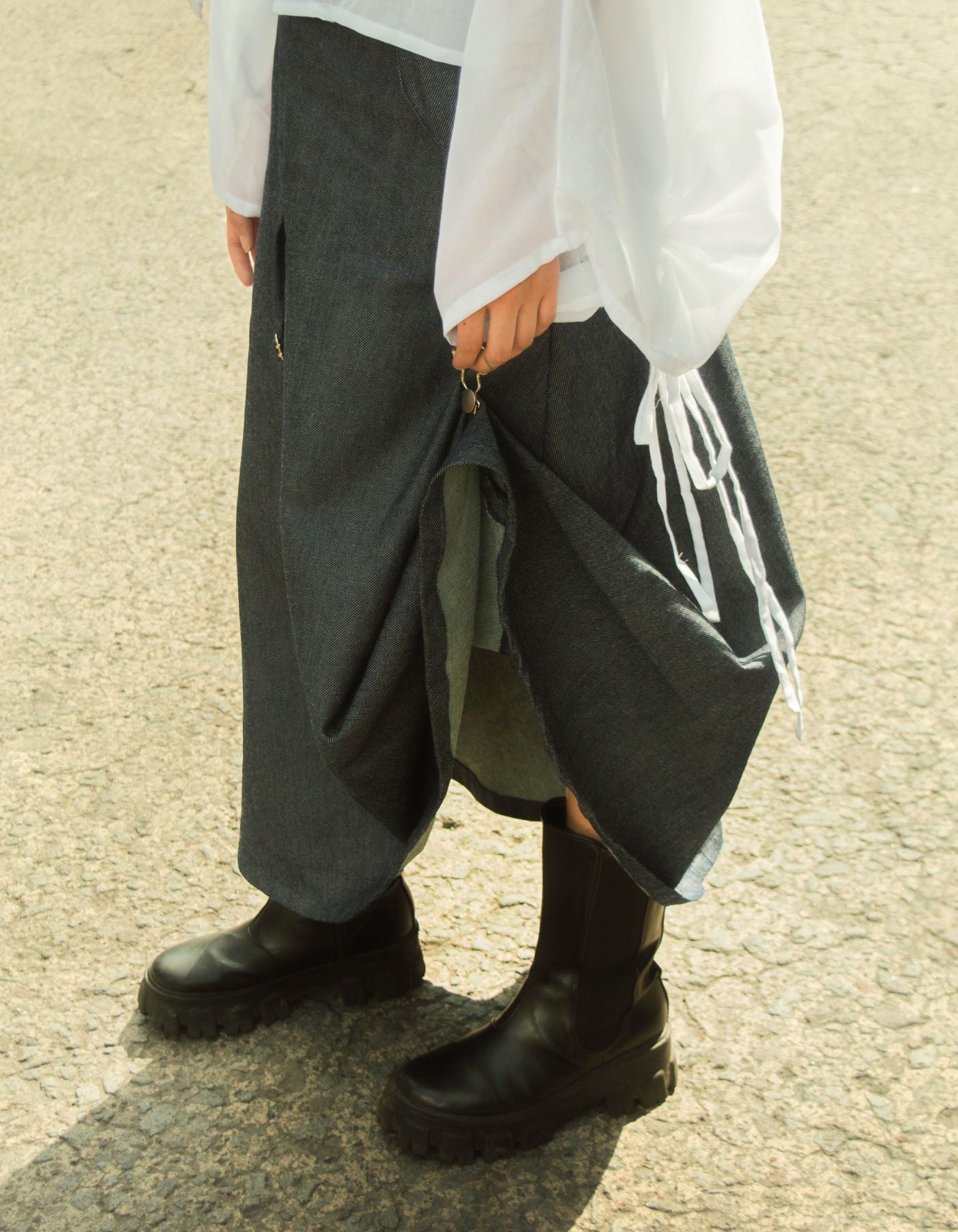 Falda ajustable en denim de cáñamo y algodón reciclado con accesorios y tiras de acero para regular la altura a ambos lados y bolsillos interiores y exteriores a ambos lados.
