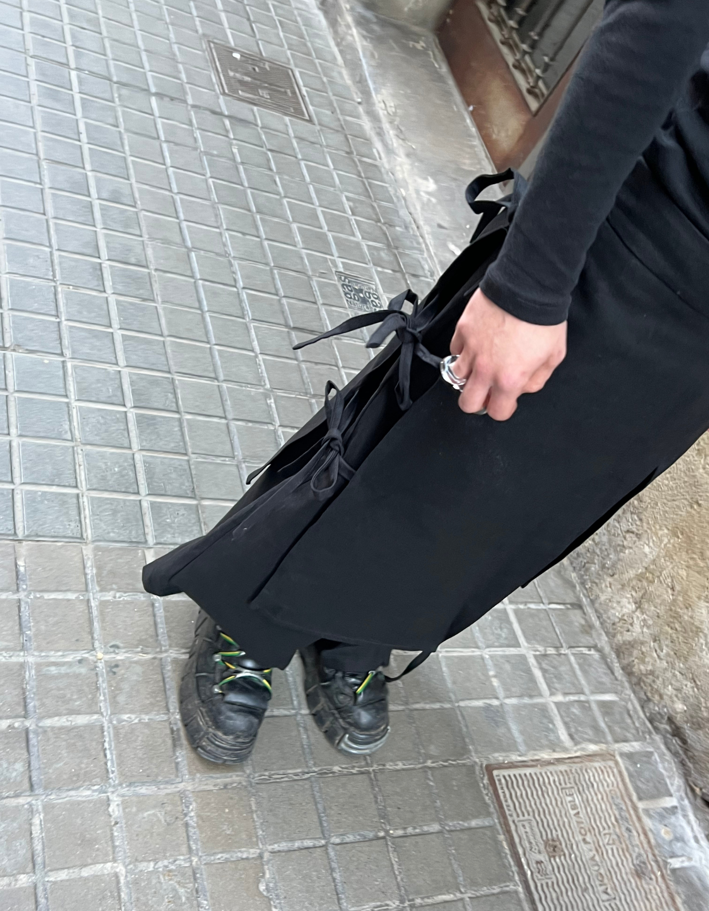 Cierre lateral y sistema de ajuste con tiras en ambos lados.